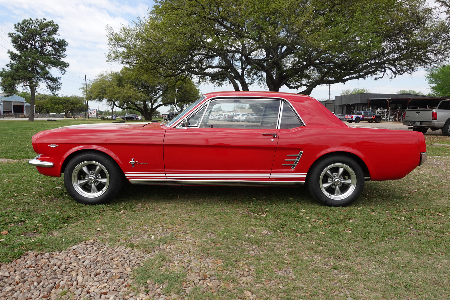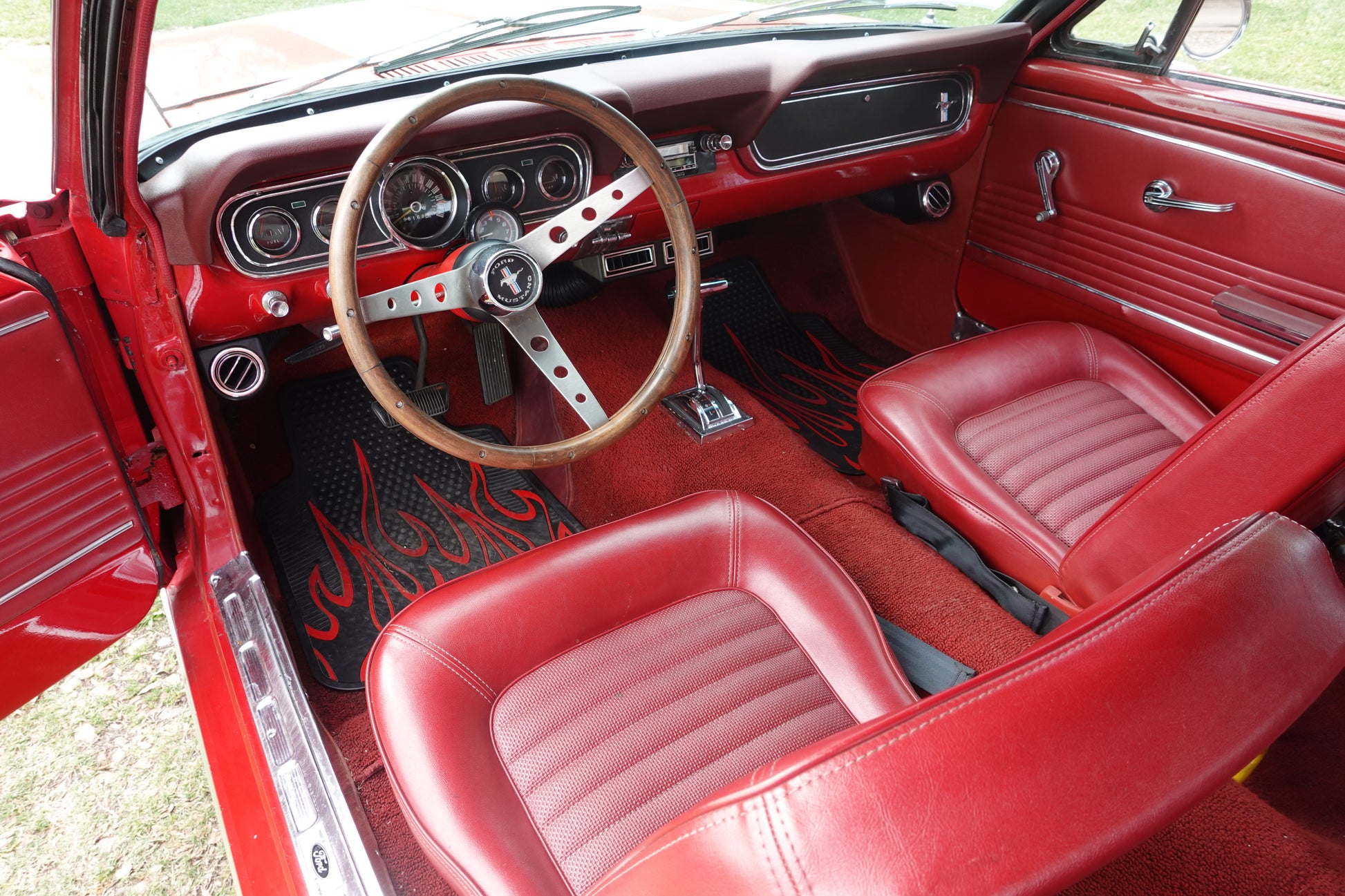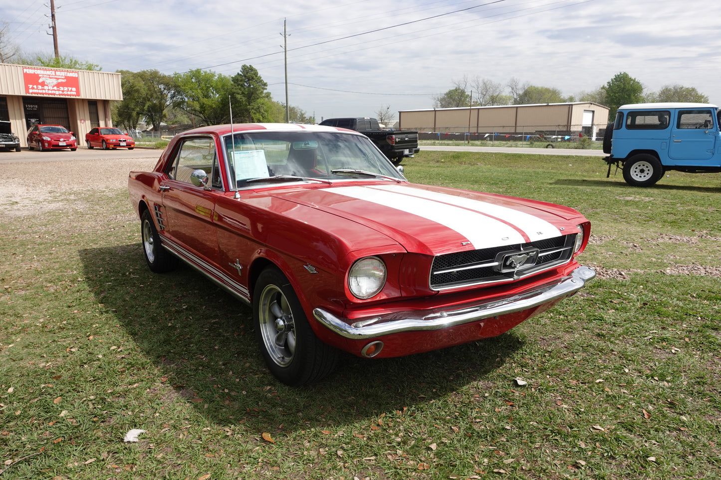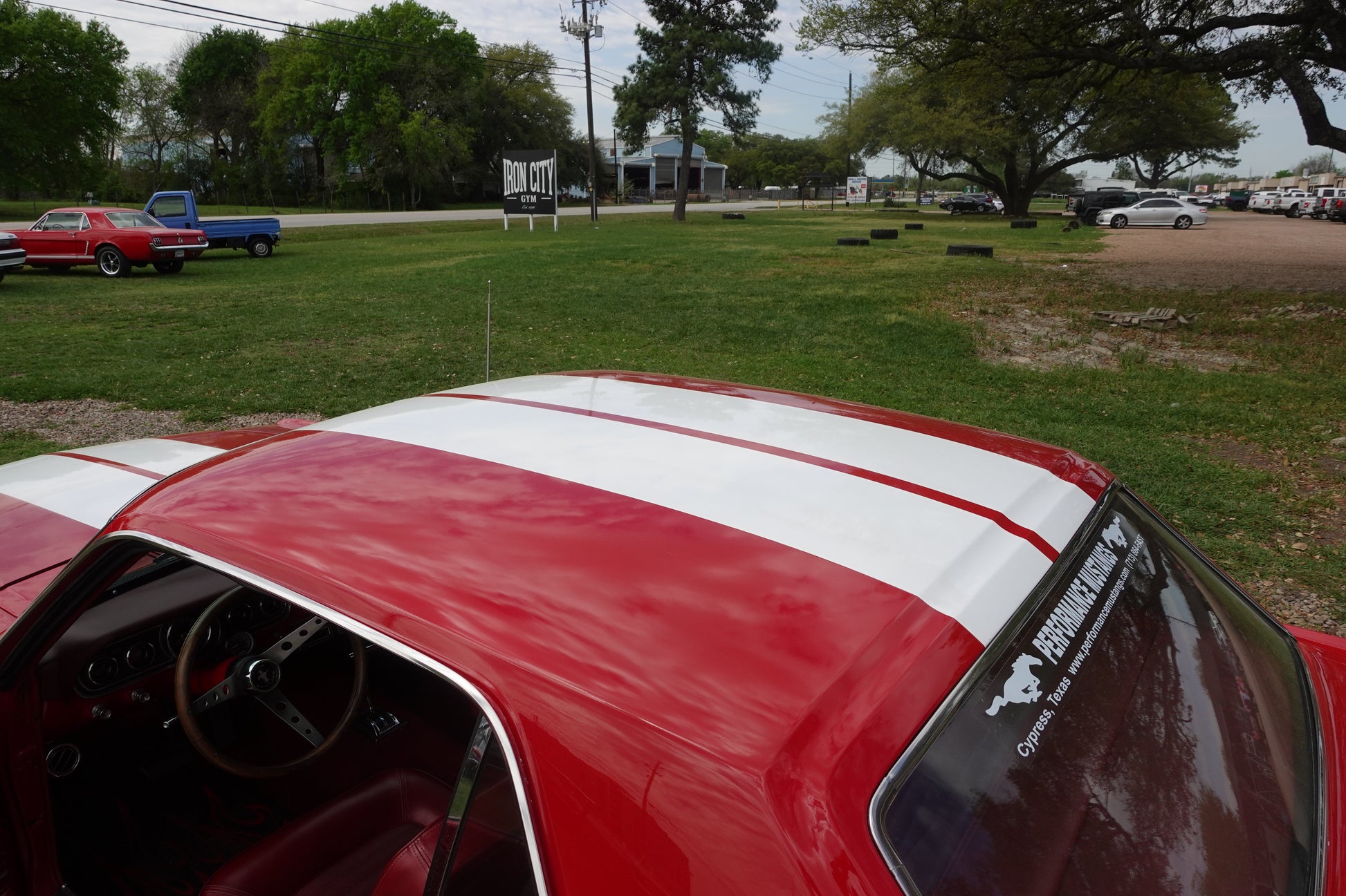 • BEAUTIFUL RUNNING 1966 MUSTANG COUPE NICELY PAINTED RED WITH WHITE SHELBY STRIPES